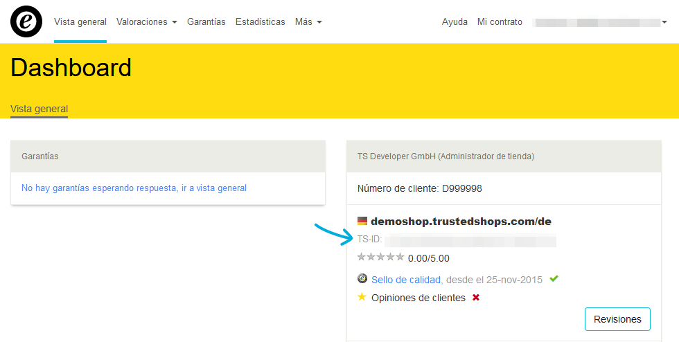 No obstante, antes de poder utilizar esta URL para enviar invitaciones de valoración, tienes que adaptarla: copia tu ID personal de Trusted Shops en la parte marcada en negrita y sustituye el componente de la URL utilizada como ejemplo con ella: «TS-ID».
