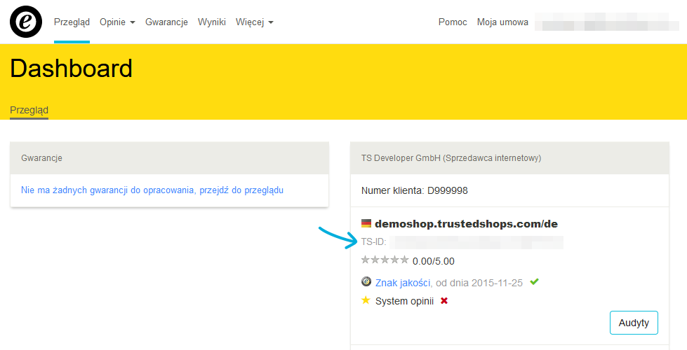 Identyfikator Trusted Shops (zaczynający się od X...) znajdziesz w swoim panelu administracyjnym w części zaplecza My Trusted Shops. Aby go odnaleźć, w pierwszej kolejności zaloguj się do My Trusted Shops klikając tutaj. Po zalogowaniu się zostaniesz przeniesiony bezpośrednio do panelu administracyjnego. W prawej kolumnie panelu wyświetlone są Twoje sklepy zarejestrowane w Trusted Shops wraz z odpowiednimi identyfikatorami Trusted Shops.
